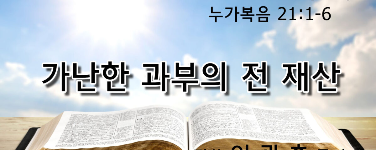 누가복음 21:1-6 (눅 21:1) 예수께서 눈을 들어 부자들이 헌금함에 헌금 넣는 것을 보시고 (눅 21:2) 또 어떤 가난한 과부가 두 렙돈 넣는 것을 보시고 (눅 21:3) 이르시되 내가 참으로 너희에게 말하노니 이 가난한 과부가 다른 모든 사람보다 많이 넣었도다 (눅 21:4) 저들은 그 풍족한 중에서 헌금을 넣었거니와 이 과부는 그 가난한 중에서 자기가 가지고 있는 생활비 전부를 넣었느니라 하시니라 (눅 21:5) 어떤 사람들이 성전을 가리켜 그 아름다운 돌과 헌물로 꾸민 것을 말하매 예수께서 이르시되 (눅 21:6) 너희 보는 이것들이 날이 이르면 돌 하나도 돌 위에 남지 않고 다 무너뜨려지리라