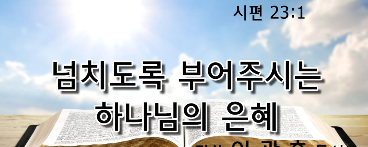 시편 23:1-6 (시편23:1) 여호와는 나의 목자시니 내게 부족함이 없으리로다 (시편23:2) 그가 나를 푸른 풀밭에 누이시며 쉴 만한 물 가로 인도하시는도다 (시편23:3) 내 영혼을 소생시키시고 자기 이름을 위하여 의의 길로 인도하시는도다 (시편23:4) 내가 사망의 음침한 골짜기로 다닐지라도 해를 두려워하지 않을 것은 주께서 나와 함께 하심이라 주의 지팡이와 막대기가 나를 안위하시나이다 (시편23:5) 주께서 내 원수의 목전에서 내게 상을 차려 주시고 기름을 내 머리에 부으셨으니 내 잔이 넘치나이다 (시편23:6) 내 평생에 선하심과 인자하심이 반드시 나를 따르리니 내가 여호와의 집에 영원히 살리로다