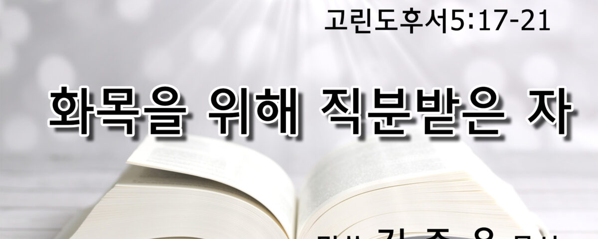 고린도후서5:17-21 (고후 5:17) 그런즉 누구든지 그리스도 안에 있으면 새로운 피조물이라 이전 것은 지나갔으니 보라 새 것이 되었도다 (고후 5:18) 모든 것이 하나님께로서 났으며 그가 그리스도로 말미암아 우리를 자기와 화목하게 하시고 또 우리에게 화목하게 하는 직분을 주셨으니 (고후 5:19) 곧 하나님께서 그리스도 안에 계시사 세상을 자기와 화목하게 하시며 그들의 죄를 그들에게 돌리지 아니하시고 화목하게 하는 말씀을 우리에게 부탁하셨느니라 (고후 5:20) 그러므로 우리가 그리스도를 대신하여 사신이 되어 하나님이 우리를 통하여 너희를 권면하시는 것 같이 그리스도를 대신하여 간청하노니 너희는 하나님과 화목하라 (고후 5:21) 하나님이 죄를 알지도 못하신 이를 우리를 대신하여 죄로 삼으신 것은 우리로 하여금 그 안에서 하나님의 의가 되게 하려 하심이라