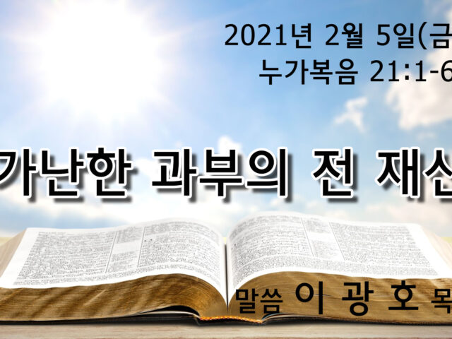 누가복음 21:1-6 (눅 21:1) 예수께서 눈을 들어 부자들이 헌금함에 헌금 넣는 것을 보시고 (눅 21:2) 또 어떤 가난한 과부가 두 렙돈 넣는 것을 보시고 (눅 21:3) 이르시되 내가 참으로 너희에게 말하노니 이 가난한 과부가 다른 모든 사람보다 많이 넣었도다 (눅 21:4) 저들은 그 풍족한 중에서 헌금을 넣었거니와 이 과부는 그 […]