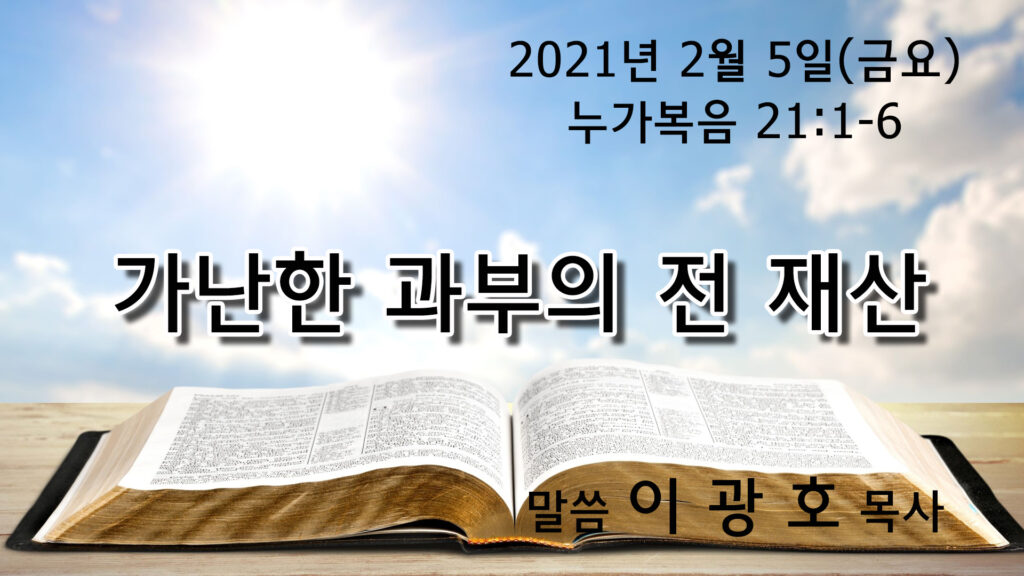 누가복음 21:1-6 (눅 21:1) 예수께서 눈을 들어 부자들이 헌금함에 헌금 넣는 것을 보시고 (눅 21:2) 또 어떤 가난한 과부가 두 렙돈 넣는 것을 보시고 (눅 21:3) 이르시되 내가 참으로 너희에게 말하노니 이 가난한 과부가 다른 모든 사람보다 많이 넣었도다 (눅 21:4) 저들은 그 풍족한 중에서 헌금을 넣었거니와 이 과부는 그 […]